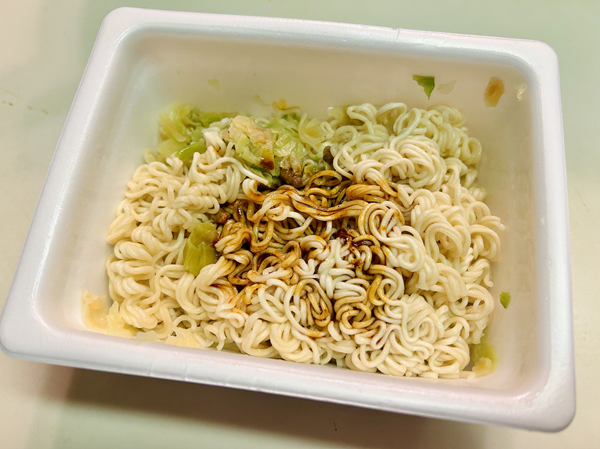 3分後、お湯を湯切り口からきって獄激辛ソースを麺にかける。ここまでは普通のペヤングだが…